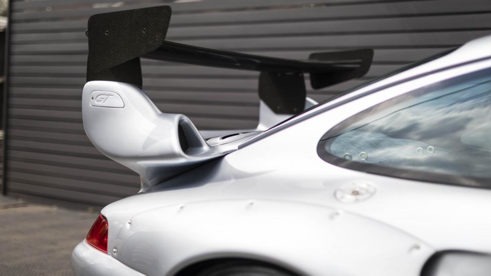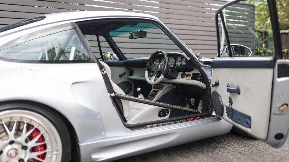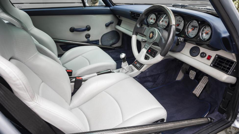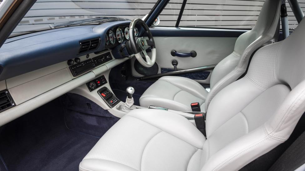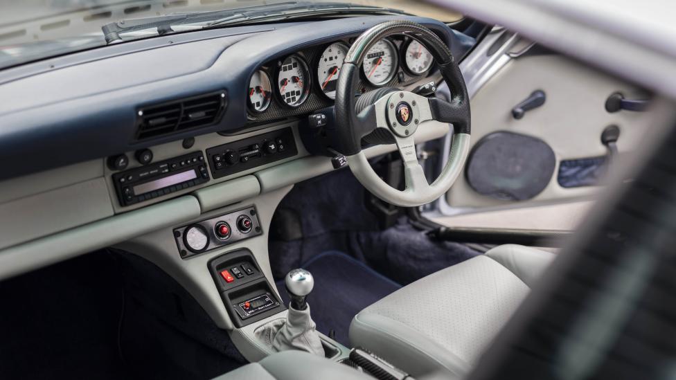 Grosso modo, cette prépa transformait la 993 Turbo en une 993 GT2 Evo, techniquement et visuellement, flat nose en prime. En effet, il ne vous aura pas échappé que le regard de grenouille de la 911 a ici cédé la place à des phares carénés dans les ailes. À l’époque, la voiture a aussi été repeinte en gris Polaire.